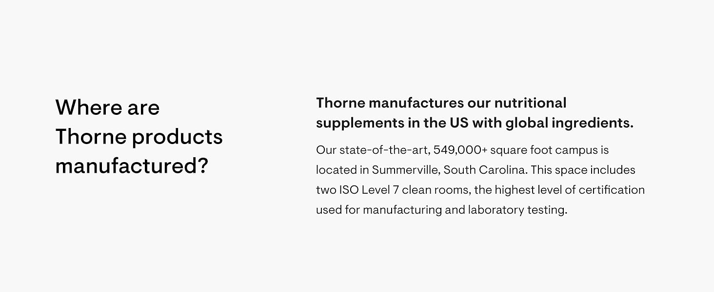 Located in Summerville, South Carolina, Thorne manufactures supplements in the USA using globally sourced ingredients. When it comes to ingredient sourcing, we seek out only the highest-quality ingredients, selecting each one for its purity and effectiveness. We maintain oversight of each ingredient’s origin, providing us complete supply chain transparency. Some ingredients are derived from natural sources, some are fermented, and others are synthesized to be bio-identical and highly absorbable.